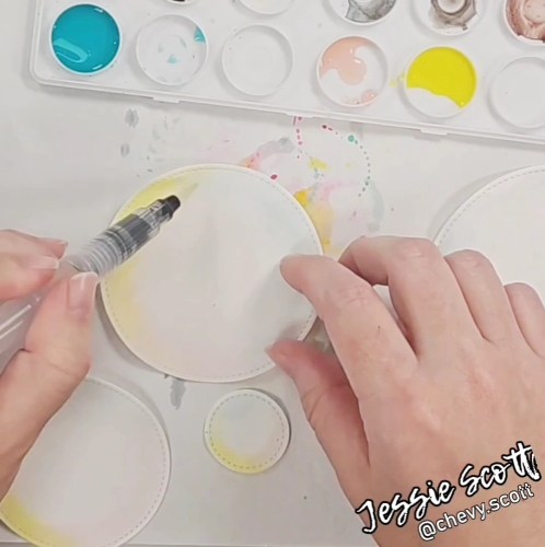 I used distress ink reinkers in squeezed lemonade, spun sugar, and salvaged patina to watercolor the edges of the circles in overlapping thirds blending the yellow, pink, blue together where they connect and fading the colors in to the center of the circles.