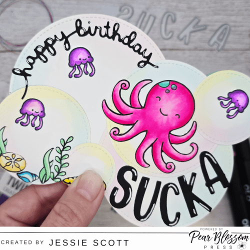 All of the rest of the colored images get added and then I added the sentiment using Lawn Fawn Happy Birthday Border die and Lawn Fawn Henry’s ABCs to spell “SUCKA”. Couldn’t resist a fun pun for an octopus! I accented the sentiments with white gel pen.