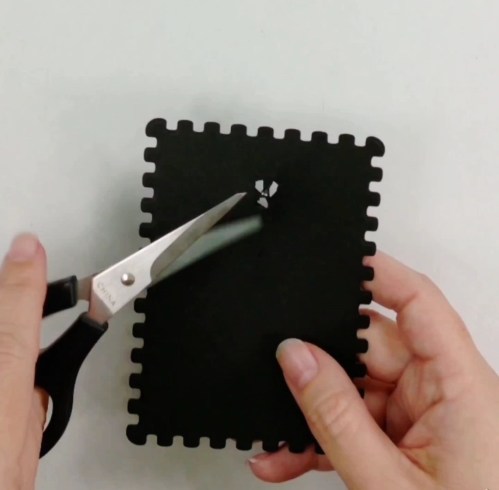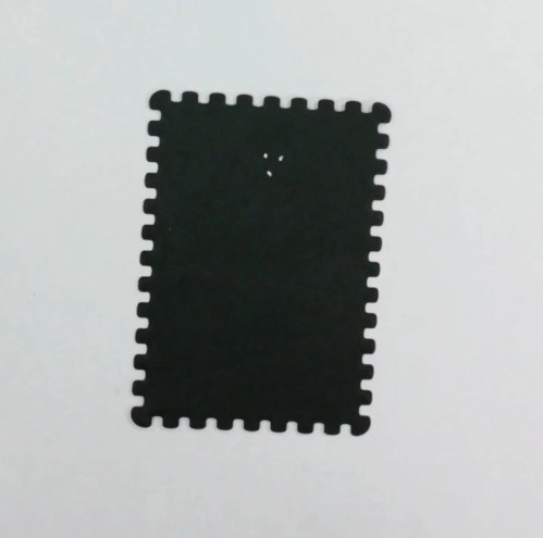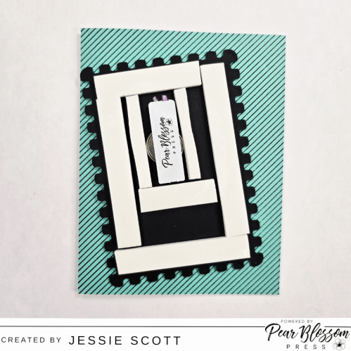 I loved the idea of black and white with a pop of turquoise so I cut out the frame panel from the Whimsy Stamps Extreme Postage Die Set in black. I used a white pen to mark the black frame spots through the cut out hearts so I could cut out holes to allow the light through both panels. I colored a piece of Pear Blossom Press Vellum purple with my OLO Markers and glued it behind the holes.