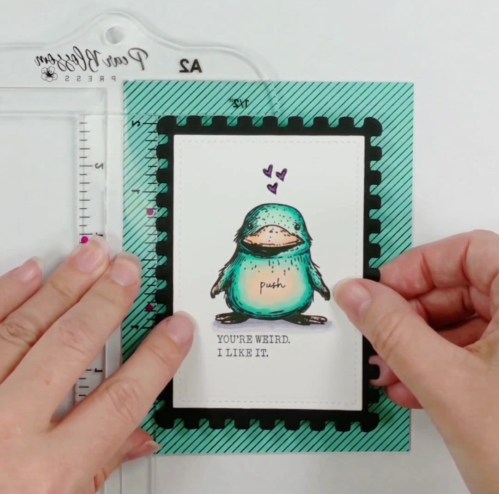 If you haven’t tried the new Pear Blossom Press A2 T-square – its AMAZING! Not only does it provide you the center points and thirds for both sides of an A2 card, you flip it over and it provides a jig for placing 1/2″ and 3/8″ bordered panels. The Extreme Postage Die was the perfect dimension to use the 1/2″ border for this card. Perfect placement!