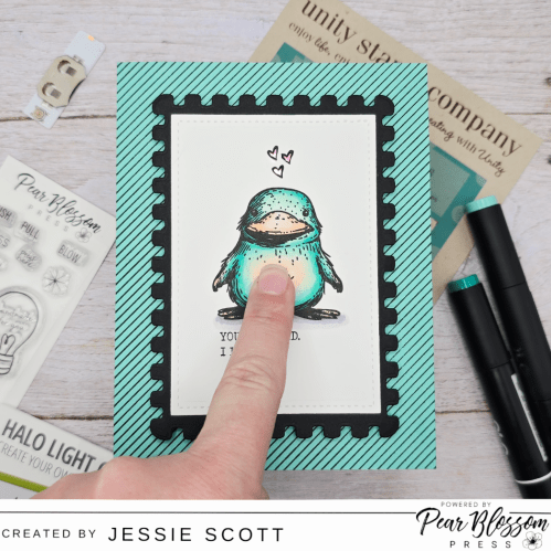 I added some Pear Blossom Press World’s Greatest Foam Tape and now it is ready to complete! I used the Altenew Pinstripe Stamp Set to add some fun pattern to the turquoise card base before finishing up the card assembly.