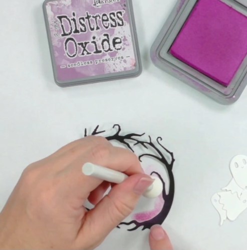 I cut out the Simon Says Stamp Spooky Tree Arch Dies and I used Simon Says Stamp Mini Ink Pouncers and Seedless Preserves Distress Oxide to highlight the tree arch die cut with a spooky purple. I colored the ghosts with grey accents with my OLO Markers. I then also cut out the tree arch as a window through the grey piece.