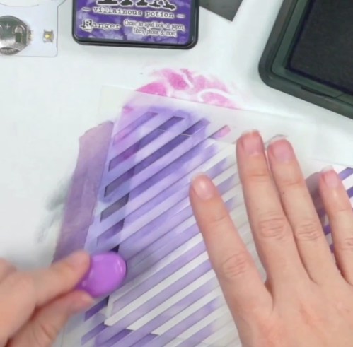 I made a fun edge border for the card using Pinkfresh Studio Diagonal Stripe Stencil and Villainous Potion Distress Ink.