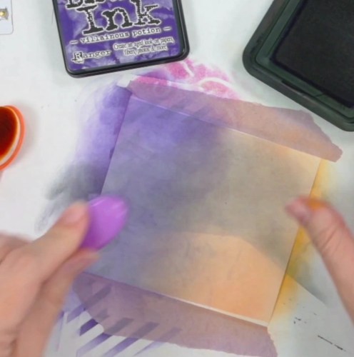 To match, I used the Villainous Potion and Carved Pumpkin distress oxide to ink up both sides of the Pear Blossom Press Vellum I wanted to place behind the tree arch. Two coats gave the best look for what I was going for.