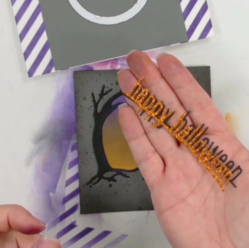 I splattered the top of the grey piece, added Black Soot Distress Ink on the edges, inlayed the tree, and then mounted the inked up vellum to the back. For the sentiment, I cut the Lawn Fawn Happy Halloween Line Border in orange glitter paper and black so I could offset to have a shadow.