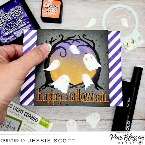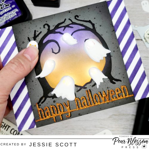 Its time to assemble! I placed the Pear Blossom Press Halo Light where the 5 lights shine through the trees and can light up the ghost eyes. Then I framed the light with Pear Blossom Press World’s Greatest Foam Tape. When I tested the light, I was able to adhere the ghosts perfectly in place.
