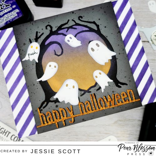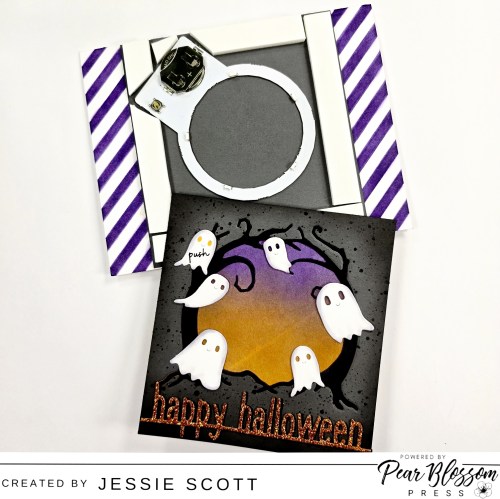 I cut out one more ghost to use a button and used the Pear Blossom Press Stamp and Die Set for “press”.