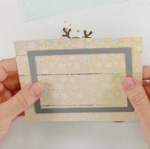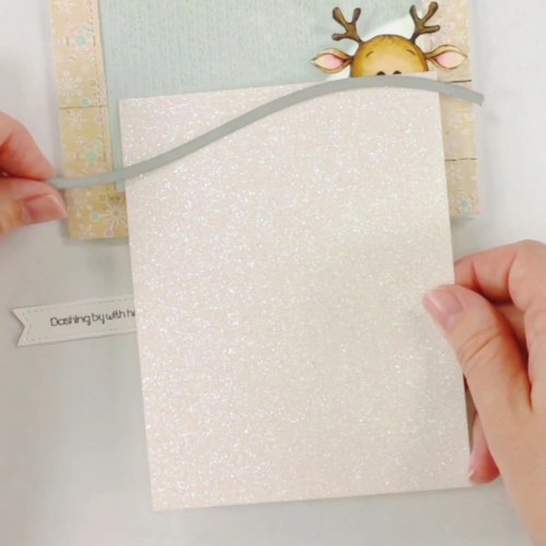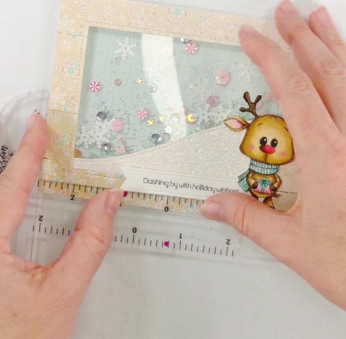 I still had a little bit of the light showing through so a crafty friend suggested using a snow slope. I used the Lawn Fawn Stitched Hillside Borders and some iridescent paper to add a slope on the front of the acetate. DON’T ADHERE YET 🙂