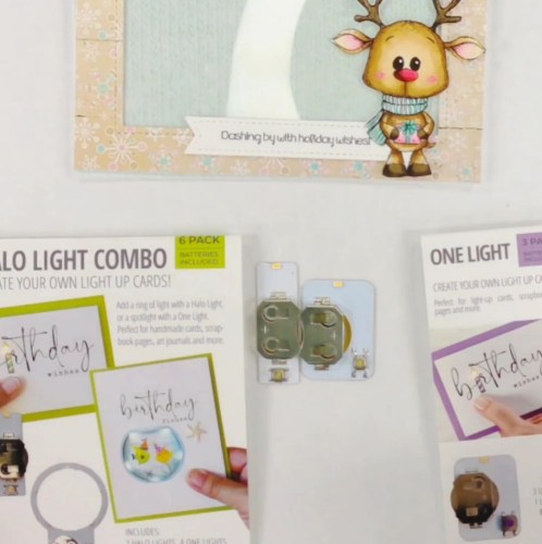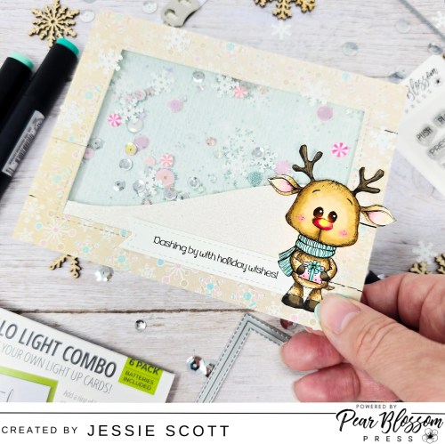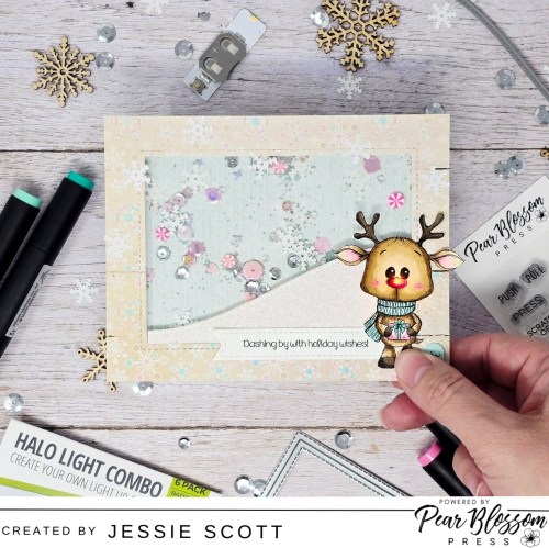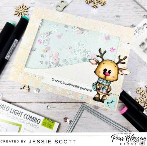 Greetings! Let’s have some fun with products from Pear Blossom Press today! I decided to use this super cute deer from Unity Stamp Company and give him a fun shaker background and ALSO light up his cute nose. I used the Pear Blossom Press Halo Light Combo Pack (One Light).
