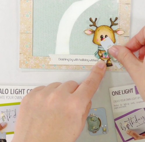 I compared the two different One Lights to see which one will let me hide the assembly behind the deer image and also have the button in just the right spot. I decide on the Pear Blossom Press Halo Light Combo Pack One Light and put away the Pear Blossom Press One Light.