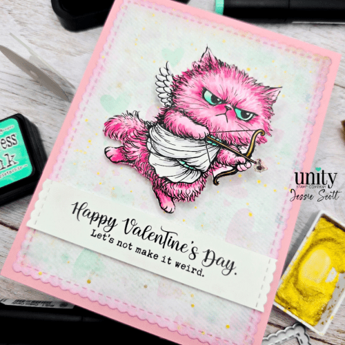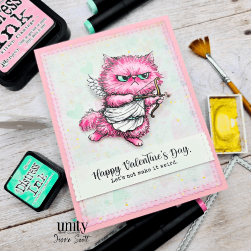 Greetings! Let’s have some fun with products from Unity Stamp Company today! I’m using the Cupid Pissy Kitty and he is coming in hot on a Large Action Wobbler. Coloring and assembly video at the end of this post!