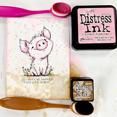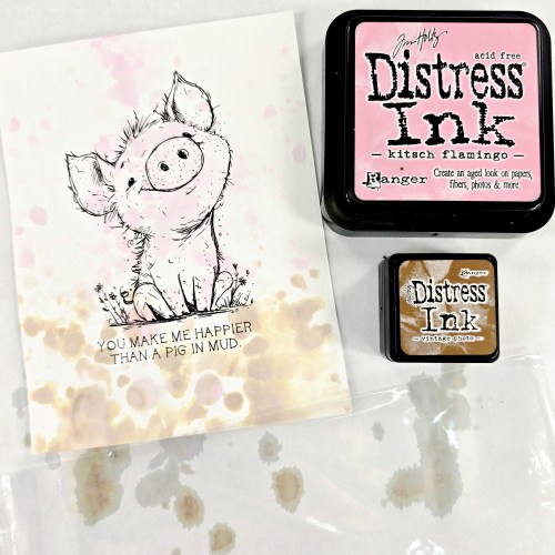 Stamp Distress Ink Kitsch Flamingo on plastic packaging and spritz with water. Lift plastic and smoosh onto areas of and around the piggie. Repeat with Vintage Photo on the ground part.