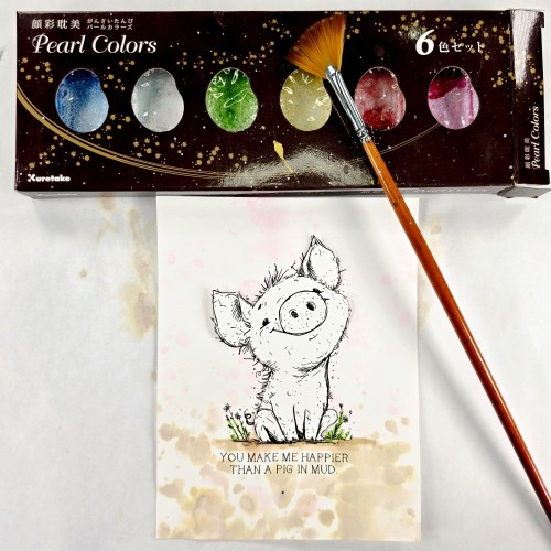 - Stamp piggie with sentiment below it with watercolor safe ink and then set it with heat. Sample uses Stellar Ink Black Widow.