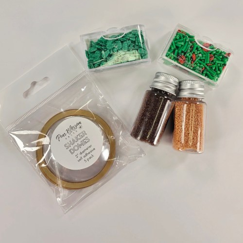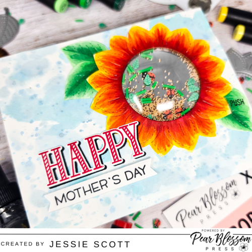 Take the Pear Blossom Press Shaker Dome and insert into the die cut hole in the A2 card front. I mounted it with double-sided tape. Fill the dome with a SMALL amount of shaker bits and some caviar/micro beads. Don’t overfill since you want to still be able to see the message through the dome.