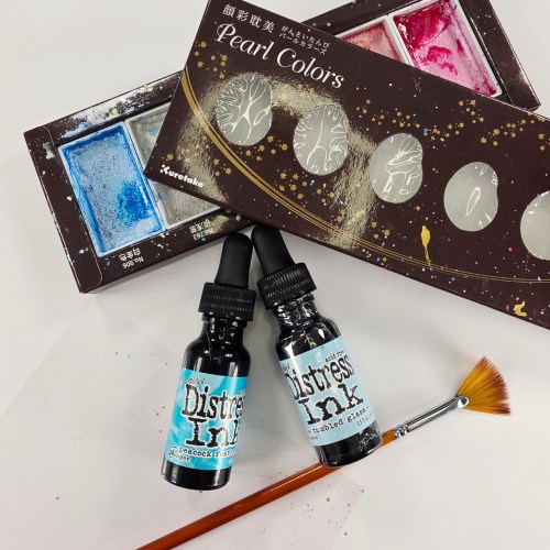 - Distress Ink Peacock Feathers and Tumbled glass reinkers