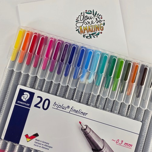 On the card base, stamp the “You are so Amazing” sentiment from Lawn Fawn more magic messages through the newly die cut hole in the card front and then color with Staedtler triplus fineliners 0.3mm.